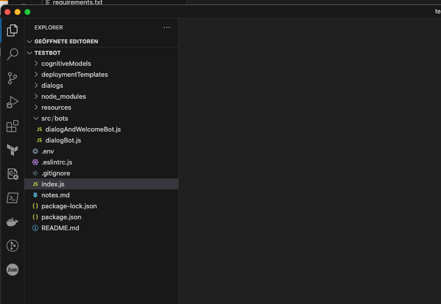code .I picked a "core bot" and "javascript". So that is how my basic project looks right now. The bot itself i moved to "src/bots" - other than that all default...