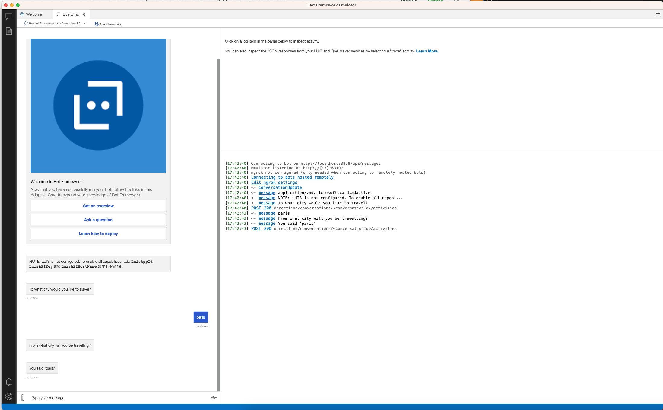 Like seen before in the code (dialogs folder), this bot can have some conversation with me to book a flight. It asks "To what city would you like to travel?" - you can enter "paris" and "london" as destination and also give a date. It will then reply with a confirmation and restate the information that was entered.